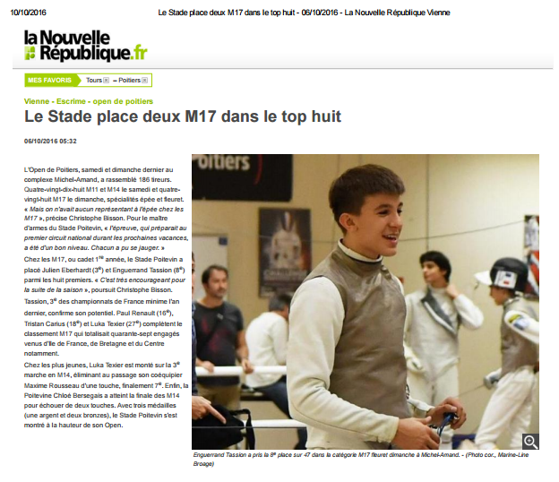 Le stade place deux M17 dans le top 8Mis à jour : lundi 10 octobre 2016 12:31Article paru dans la nouvelle république du 6 Octobre 2016. Stade Poitevin Escrime - Poitiers Précédent Suivant Tweeter Share Share powered by social2s